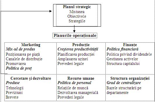 Strategia este menita sa descrie imaginea pe care o organizatie doreste sa o aiba in viitor si este orientata catre ceea ce vrea sa faca organizatia, iar nu catre cum vrea sa actioneze. Managerii folosesc frecvent termeni ca strategie de piata sau strategie financiara atunci cand de fapt se refera la un plan de pozitionare a produselor lor pe o anumita piata sau la un plan de alocare de resurse financiare, pentru a desemna deci planuri operationale destinate realizarii strategiei organizatiei. Strategia este definita drept cadrul ce orienteaza alegerile care determina natura si directia unei organizatii. Strategia ajuta la stabilirea unei directii unitare pentru organizatie in termenii obiectivelor sale operationale si furnizeaza baza alocarii resurselor necesare pentru orientarea organizatiei catre atingerea acestor obiective. Planificarea strategica stabileste directia si obiectivele, in timp ce planificarea operationala se refera la luarea de decizii zilnice la nivele mai joase ale organizatiei. Planificarea strategica se orienteaza spre a face lucruri bune (lucrurile care trebuie sau eficacitate), iar planificarea operationala, spre a face lucrurile bine (lucrurile cum trebuie sau eficienta). Figura urmatoare ilustreaza relatia dintre planul strategic si planurile operationale (planul strategic este implementat prin dezvoltarea de planuri operationale in acord cu obiectivele, misiunea si strategiile organizationale):