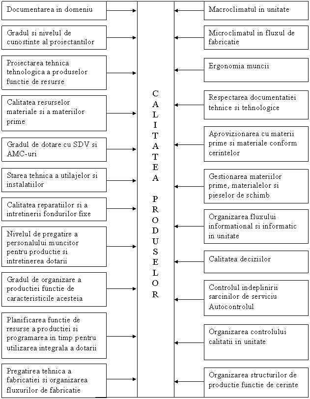 - calitatea fabricatiei desemneaza gradul de conformitate a produsului cu documentatia tehnica. Aceasta se realizeaza in productie si este determinata de procesul tehnologic, echipamentul de productie, activitatea de urmarire si control, manopera.