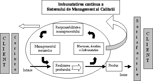 Planifica: - Stabileste obiectivele si necesarul de procese pentru a furniza rezultatele, in conformitate cu cerintele clientului si cu politicile organizatiei. Executa: - Implementeaza procesele. Verifica: - Monitorizeaza si masoara procesele si produsele, fata de politicile, obiectivele si cerintele pentru produs si raporteaza rezultatele. Actioneaza: - Intreprinde actiuni pentru imbunatatirea continua a performantelor procesului. Activitati si rezultate planificate Activitati realizate si rezultate obtinute Se exprima prin "disciplina tehnologica" referitoare la procesele care asigura atingerea obiectivelor. Rezultate obtinute Resurse utilizate 4.6.5. Imbunatatirea continua - obiectiv permanent al organizatieiAceasta presupune: Analizarea si evaluarea situatiei existente pentru identificarea zonelor de imbunatatit. Stabilirea obiectivelor pentru imbunatatire. Cautarea solutiilor pentru realizarea obiectivelor. Evaluarea acestor solutii si efectuarea unei selectii. Implementarea solutiilor alese. Masurarea, verificarea, analizarea si evaluarea rezultatelor implementarii pentru determinarea nivelului de realizare a obiectivelor. Standardizarea schimbarilor. S-a renuntat la structurarea cerintelor pe cele 20 de elemente din ISO 9001:1994. Se pune un accent suplimentar pe imbunatatirea continua (ISO 9001:1994 nu contine o clauza similara). Sistemul calitatii este mijlocul prin care o organizatie isi defineste si demonstreaza procesele necesare pentru a se asigura ca produsul si/sau serviciul se conformeaza cu cerintele clientului. În tarile Uniunii Europene au fost initiate mai multe programe, orientate la îmbunatatirea competitivitatii firmelor, motivarea si instruirea personalului, satisfacerea clientilor. Printre ele "Programul European de îmbunatatire a calitatii", "Premiul European pentru Calitate", "Fundatia Europeana pentru Managementul Calitatii". O alta dimensiune a politicii de promovare a calitatii în Europa de Vest este orientarea spre dezvoltarea sistemelor de management al mediului conform seriei de standarde internationale ISO 14000, ca mijloc de control, masurare si comunicare a propriilor performante în domeniul mediului. Scopul eforturilor mentionate si a politicii europene în domeniul calitatii în general, este de a crea o imagine noua a culturii calitatii în Europa, bazata pe cooperare si conlucrare între tarile europene. Concluzii si propuneri In urma analizelor efectuate in capitolele prezentate se pot trage urmatoarele concluzii: S.C. D.M.H.I. S.A. este o organizatie de succes care marcheaza trecerea economiei romanesti la economia de piata; Analiza economico-financiara a scos in evidenta dinamica permanent ascendenta a cifrei de afaceri, a profitului si productivitatii; societatea si-a inceput activitatea cu pierderi si dupa numai 2 ani de activitate (din 2001) a inceput sa lucreze pe profit; Numarul de angajati a prezentat mici fluctuatii in perioada analizata cu tendinte de scadere din motive de productivitate a muncii; Sumele investite in tehnologie au scazut constant de la infiintare (cand au fost maxime), ceea ce nu reprezinta o solutie viabila pe termen lung; Exportul quasitotalitatii productiei in tari din vestul Europei atesta calitatea productiei realizate; Pana la proba contrarie, succesele firmei trebuie puse pe seama managementului calitatii totale folosit conform sistemului calitatii implementat in organizatie in concordanta cu standardele ISO din seria 9000. Propunerile pe care le fac in calitate de angajat al firmei D.M.H.I. S.A., cu responsabilitati in domeniul calitatii, se refera in special la organizarea controlului calitatii productiei si sunt cuprinse in urmatoarea nota sintetica pe care intentionez s-o inaintez responsabililor cu calitatea din echipa manageriala. Controlul calitatii productiei este parte componenta a managementului calitatii productiei si consta in verificarea corespondentei parametrilor de calitate ai productiei cu cerintele de calitate stabilite si inscrise in documentatia tehnica sau normativele de calitate. Deci, controlul calitatii consta in verificarea respectarii documentelor privind calitatea productiei, documente care au un caracter obligatoriu. Controlul de calitate se incheie intotdeauna cu adoptarea hotararii de acceptare sau neacceptare a productiei. 2. Controlul calitatii are diferite forme, corespunzator nivelurilor de conducere a calitatii (control de receptie a materialelor prime, materielelor si subansamblelor, control pe operatii si faze de fabricatie, control final, control al comportarii in exploatare etc). 3. Controlul calitatii poate fi realizat de muncitorul executant (autocontrol), seful de echipa, maistrul sau personalul sectiei insarcinat special cu aceasta, precum si de personalul compartimentului de control tehnic de calitate al firmei, de personalul laboratoarelor de incercari sau al statiilor si standurilor de incercare, al serviciilor tehnice, de personalul de la aprovizionare si desfacere (merceologi, comisii de receptie), inclusiv de specialisti in audit-ul calitatii. 4. Clasificarea controlului de calitate are la baza urmatoarele criterii si anume: 4.1. Caracterul mijloacelor de control, conform caruia deosebim: control automatizat, control mecanizat si control manual; 4.2. Obiectul controlului conduce la urmatoarea clasificare: controlul materiilor prime si materialelor; controlul produselor obtinute prin cooperare; controlul sculelor si dispozitivelor tehnologice; controlul aparatelor si instrumentelor de masura si control; controlul dispozitivelor si standurilor de incercari; controlul pe faze de fabricatie si in final al pieselor, subansamblelor si produselor; controlul documentatiei tehnice si comerciale insotitoare; controlul ambalajului si al incarcarii produselor finite; controlul calificarii personalului; controlul disciplinei tehnologice; controlul depozitarii materiilor prime, materialelor, produselor de completare si a productiei finite; controlul realizarii masurilor de 