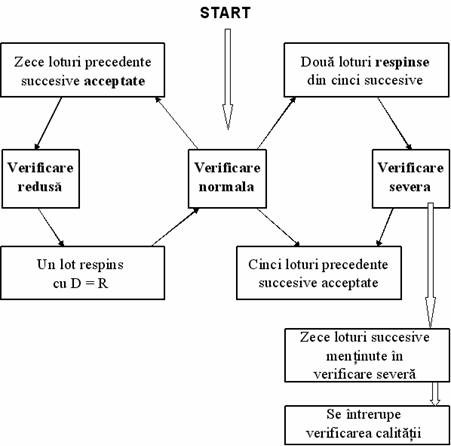 daca k1 + k2 ≤ A2 daca k1 + k2 ≥ R2 lotul se accepta lotul se respinge Marimea esantionului si a conditiei de acceptare este dependenta de stabilitatea proceselor de fabricatie la furnizori, de seriozitatea acestora, de rezultatele controalelor anterioare. Acceptarea unui lot este determinata pe baza utilizarii unuia sau mai multor planuri de verificare, asociate uneia sau mai multor valori specificate ale lui AQL. In cazul defectelor critice furnizorul verifica fiecare unitate de produs din lot. La gasirea primului defect critic se face respingerea īntregului lot. Standardul prevede si regulile pentru modificarea severitatii de verificare a calitatii (verificare normala, severa sau redusa) Fig. 23. Verificarea normala se aplica la īnceputul verificarii sirului de loturi livrate si continua pīna cānd devine necesara aplicarea unui alt tip de verificare (severa sau redusa). Verificarea severa se instituie īn cazul īn care din cinci loturi succesive, doua sunt respinse si este abandonata īn situatia īn care nici un lot din cinci succesive nu este respins. Verificarea redusa se aplica īn cazul īn care zece loturi succesive au fost acceptate la o verificare normala si sunt īndeplinite simultan o serie de conditii: