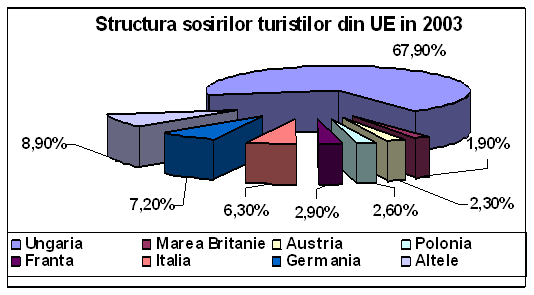 Structurile de cazare turistica din România au primit, în 2003, 5,73 de milioane de turisti, dintre care 1,51 milioane au fost straini - ceea ce reprezinta 26,45% din total. Potrivit cifrelor furnizate de catre INCDT, numarul total al turistilor sositi în hoteluri, moteluri, pensiuni si alte structuri de cazare a înregistrat o crestere de 24% fata de 2002. În cazul turistilor români, cresterea a fost de 15,04%, iar în cazul celor straini, de. 51,92%.