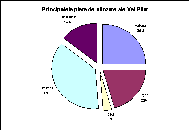 Pietele de desfacere ale produselor Vel Pitar sunt: judetul Vîlcea cu o pondere de 80% din totalul vânzarilor societatii. Vânzarile se realizeaza atât prin reteaua proprie de vânzare a societtii (19 magazine) cât si prin vânzarile realizate catre clientii - persoane juridice pe baza de contracte, sucursala Bucuresti detine 27 magazine proprii, judetul Cluj are o retea de 11 magazine Vel Pitar, Pitesti si Targu Jiu detin fiecare câte 14 puncte de desfacere Vel Pitar, orasul Brasov detine 18 magazine Vel Pitar, locatiile Giurgiu si Iasi reprezinta o oportunitate pentru extinderea Vel Pitar, în prezent existând doar 6, respectiv 7 magazine marca vel Pitar în aceste orase, iar orasul Tecuci pune la dispozitia clientilor un numar de 12 puncte de desfacere Vel Pitar.
