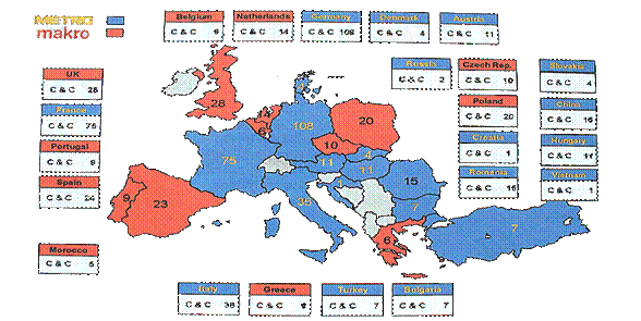 Prezentarea cronologica a evolutiei si expansiunii concernului în ultimii trei ani poate fi ilustrata prin tabelul de mai jos. În ceea ce priveste importanta pietelor pe care îsi desfasoara activitatea cash&carry, Germania ocupa locul central cu 109 magazine, urmata de Franta si Italia, iar cele mai putin viabile sunt reprezentate prin Slovacia si Danemarca, regiuni ce au cunoscut o stagnare în perioada 2000-2003.