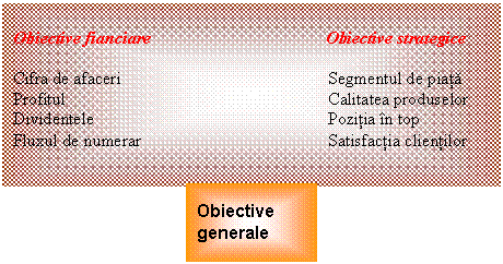 Concretizarea misiunii se face printr-un set de obiective masurabile si realiste ce permit evaluarea si controlul performantelor organizatiei. Obiectivele generale ale concernului se prezina sub forma unui "prag", ca nivel minim acceptat sau marimi tinta", ca nivel dorit spre a fi de atins[1] . Pentru fixarea unei strategii consistente se impun a fi luate în considerare atât obiectivele financiare, cu exprimare predilecta în unitati monetare, cât si cele de ordin strategic, ce iau forma unitatilor fizice sau de alta natura.