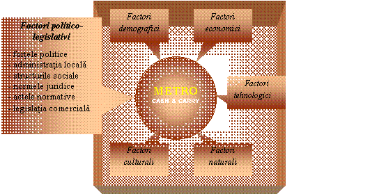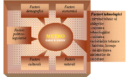 Aceasta analiza, ca prim pas în elaborarea strategiei firmei METRO , cuprinde fortele externe care actioneaza asupra întreprinderii, macromediul, si a micromediului stimulând sau frânând activitatea desfasurata de aceasta. Acesti factori exercita în permanenta o influenta mai mica sau mai mare asupra activitatii întreprinderii, aflându-se într-o permanenta schimbare. Toate firmele sunt constiente de acest lucru dar nu toate sunt la fel de eficiente în monitorizarea mediului extern, a tendintelor factorilor de mediu si în adaptarea activitatilor desfasurate în consecinta. Elementele macromediului sunt clasificate în sase mari categorii: mediul demografic, mediul economic, mediul tehnologic, mediul natural, mediul cultural si cel politico-legislativ. Problema fundamentala a analizei mediului înconjurator este de a întelege modul în care acesta influenteaza organizatia si, lucru mai dificil, modul în care o va face în viitor.