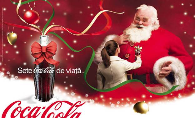 Mos Craciun tinea în mâna sticle de Coca-cola, bea Coca-Cola,primea si daruia Coca-Cola;
