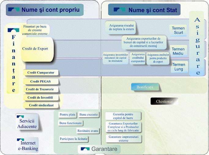 Unul din obiectivele EximBank il constituie imbunatatirea mecanismului de sustinere si stimulare a exporturilor prin cresterea ofertei de produse si servicii si flexibilizarea celor existente, oferta supusa procesului de modernizare si eficientizare atat din punct de vedere calitativ, cat si cantitativ si cu orientare permanenta catre clienti.