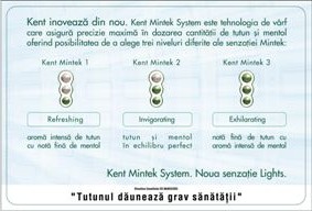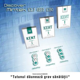 In acest sens lansarea noului brand Kent Mintek continua seria inovatiilor prin revolutionarea segmentului de mentol pe piata din Romania Sistemul Mintek dozeaza cu precizie diferite cantitati de tutun si menthol, oferind posibilitatea de a alege intre trei niveluri ale senzatiei Mintek.
