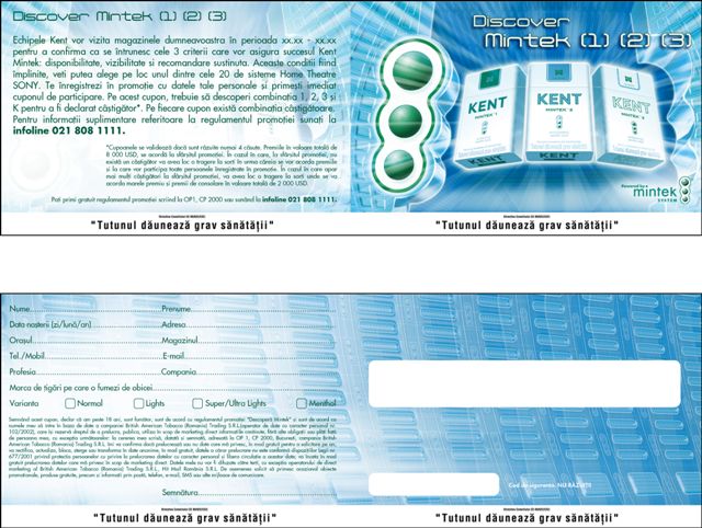 Generare de trial in randul consumatorilor tinta Kent Mintek si atingerea unui nivel de 16,800 contacte reusite la nivel national
