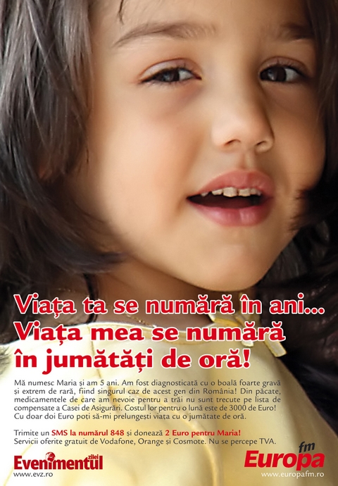 Romantic Fm și Evenimentul Zilei au creat o campanie ce vine in ajutorul Mariei, o fetița de 5 ani diagnosticata cu o boala rara. Prin intermediul unor cuvinte cu impact puternic se incearca salvarea vieții acestei fetițe.