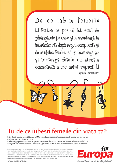 Campania ”Tu de ce iubești femeile?” țintește barbații care au o partenera de viața sensibila și care adorm seara pe versurile romantice alel lui Mircea Cartarescu. Este o campanie care in perioada 1-8 martie poate oferii barbaților un cadou pentru jumatațile lor, mai exact o carte cu autografului autorului Mircea Cartaresc sau un alt cadou car o vor face sa se simta mai frumoasa.