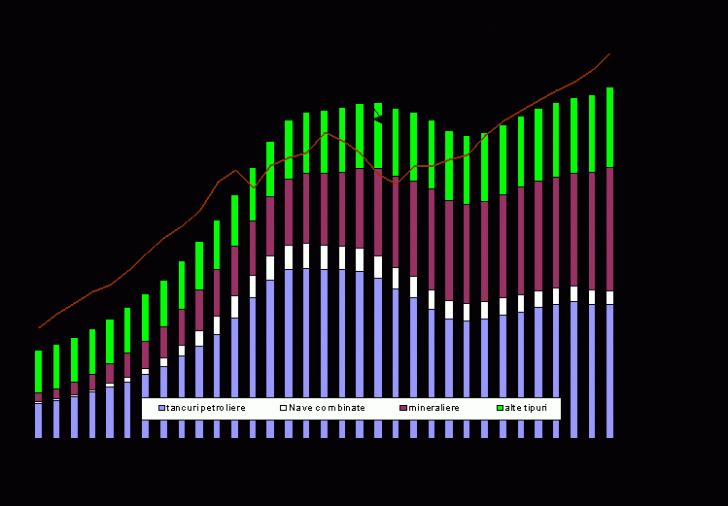 Tot odat\, dezvoltarea flotei de vrachiere a f\cut ca, ^n condi]iile unui flux comercial maritim ce a consemnat o tendin]\ ascendent\, dinamica ^nregistrat\ de tonajul navelor de tip cargou s\ fie relativ lent\, fenomen ^nso]it [i de o relativ\ sc\dere a procentului de m\rfuri transportate cu aceste nave.