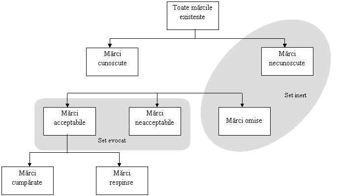 Evaluarea alternativelor. Procesul de informare este considerat încheiat daca sunt identificate alternative care pot satisface nevoia perceputa. Dar din întreaga gama de produse existente consumatorul nu cunoaste decât o parte, iar din acestea poate accepta doar un numar redus de marci (fig.3.7).