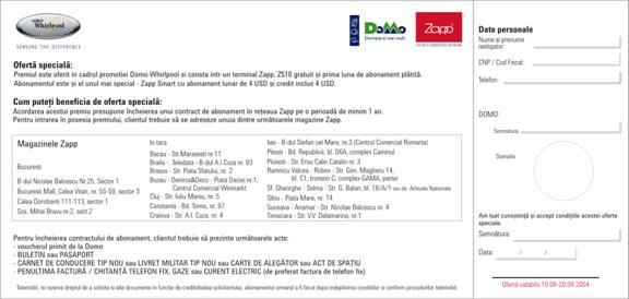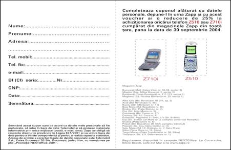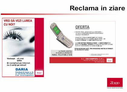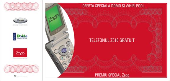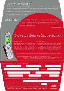 Zapp Mobile, singurul sistem de telefonie mobile de ultima generatie din Romania, ofera cele mai noi produse de voce si date la preturi competitive. Astfel, Zapp s-a dovedit a fi o solutie de comunicare totala. Avantajele acestui serviciu sunt: reduceri importante ale costurilor convorbirilor, control complet al costurilor convorbirilor si transmisiunilor de date, calitate ridicata a retelei si convorbirilor, securitate maxima a convorbirilor, optiuni multiple de comunicare direct de pe telefon, servicii de calitate si acoperire teritoriala in continua dezvoltare.