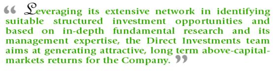 AHC Direct Investments comprise of those companies in which it has a long-term investment. Al-Ahlia Holding its proprietary capital in its direct investment activities. After a successful track record in local markets, the Company is now looking at an expansion of its geographic focus and is exploring high growth emerging market economies as well. The Direct Investments team serves to: |