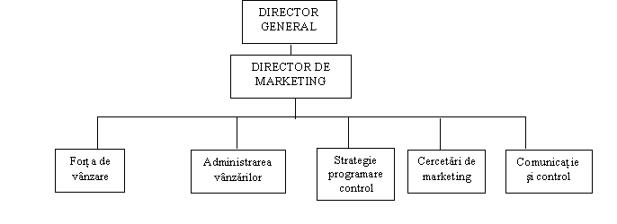 3. - în care activitatile de marketing se desfasoara într-un compartiment specializat - compartimentul de marketing (fig.12.2) - întrucât functiunea de marketing se impune ca functiune distincta în perioada postbelica. Este denumit si stadiul marketingului integrat, în care compartimentul de marketing alaturi de celelalte este subordonat conducatorului întreprinderii. În compartimentul de marketing sunt concentrate toate activitatile de marketing, care se reflecta direct în eficienta activitatii întreprinderii. Aceasta formula este caracteristica orientarii moderne a întreprinderii care-si desfasoara activitatea în viziunea de marketing. Se aplica în întreprinderile mari, care au volum si structura complexa de productie ce se adreseaza unei piete segmentate si dinamice, ceea ce impune întreprinderii utilizarea de personal specializat în problemele de marketing. Apare astfel, în cadrul întreprinderii un nou domeniu de activitate ce se constituie ca subsistem, în ansamblul structural al acesteia, marketingul.
