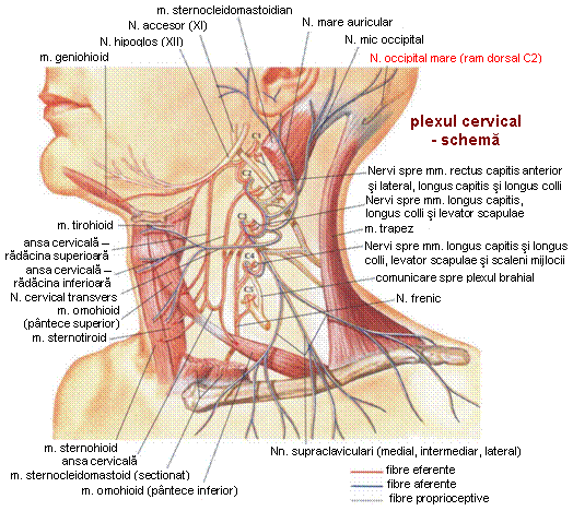 Nevralgia de nerv Arnold (N. occipital mare, ram dorsal N. spinal C2): trebuie avuta in vedere pentru diagnosticul diferential al sindroamelor algice cu localizare la nivelul extremitatii cefalice (presupune palpare la nivelul regiunii occipitale, unde nervul occipital mare devine superficial).