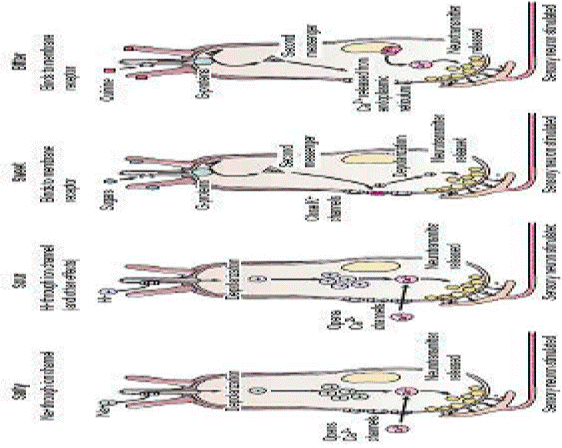 1) concentraTia substanTei solvite - receptorul are un prag minim de excitaTie (mai ridicat pentru substanTele dulci si mai scazut pentru cele amare. Apare astfel un mecanism de protecTie faTa de alcaloizii (substanTe amare) care au un potenTial