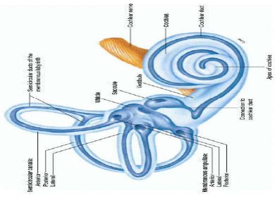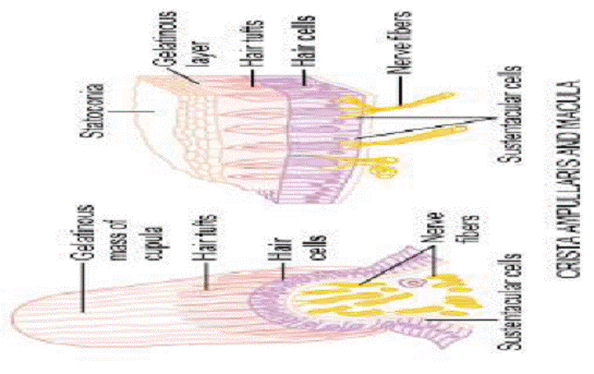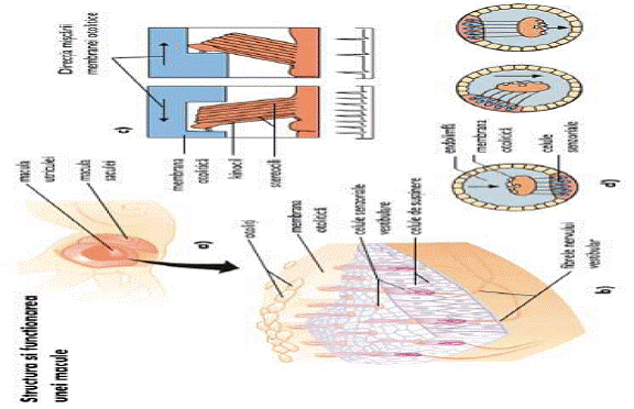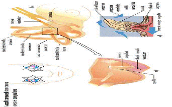 opusa miscarii corpului) si crestele ampulare care sunt formate din celule de susTinere, cupula (o masa gelatinoasa situata la polul apical al celulelor senzoriale) si celule senzoriale vestibulare.