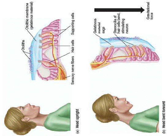 Inclinarea capului cu 1-2 grade faTa de poziTia de repaus (pragul diferenTei de inclinare a capului) determina descarcarea de impulsuri de la receptori, frecvenTa crescand pe masura cresterii gradului de inclinare a capului. Saculele sunt stimulate prin inclinarea laterala a capului, in timp ce utriculele sunt excitate de inclinarile anterioare sau posterioare ale acestuia sau de acceleraTia orizontala a corpului. InformaTiile de la macule sunt emise in cursul deplasarii capului dar si pe toata durata menTinerii