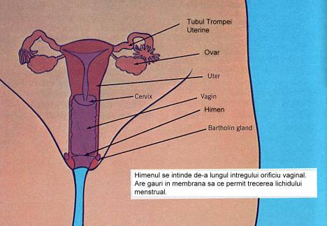 Himenul este un sept membraniform care inchide intrarea in vagin. Prezinta un orificiu a carui forma poate fi : inelara, cribiforma (ciuruit), semilunara. Prin orificiul himenului se scurge in afara sangele menstrual. La primul raport sexual himenul se rupe in mai multe locuri, dand nastere dupa cicatrizare la carunculii himenali ; ia nastere, rupturile se accentueaza si mai mult, lasand cateva resturi numite carancul mirtiformi.