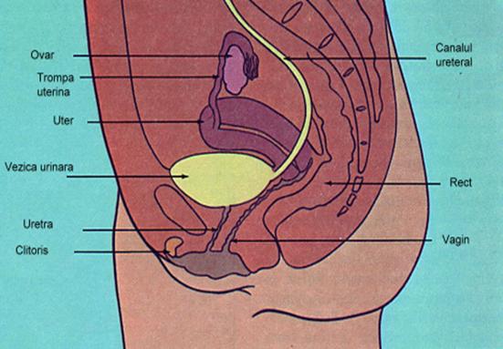 Uterul. Este un organ musculos, cavitar, nepereche, asezat in mijlocul bazinului mic, intre vezica si rect. Are rolul de a primi in cavitatea sa ovulul fecundat, sa-l protejeze, sa-l nutreasca in timpul dezvoltarii sale si sa-l elimine la exterior cand a ajuns la maturitate. Uterul are forma de para, extremitatea superioara mai lata din care pleaca trompele uterine se numeste corpul uterin, iar cealalta inferioara mai stramta se numeste colul uterin (cervix). Intre corp si col se gaseste o portiune numita istm. Uterul este turtit dinainte-inapoi si prezinta prin urmare doua fete, una anterioara, numita vezicala, fiindca este in raport cu vezica urinara si separata de aceasta prin fundul de sac vezico-uterin si una posterioara in raport cu rectul de care o separa fundul de sac recto-uterin. Are de asemenea doua margini laterale - una dreapta, alta stanga - la nivelul carora circula arterele uterine.
