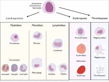 Granulocitopoieza pornește tot de la celula stem pluripotenta care se afla și la originea hematiilor. Din aceasta se diferențiaza celula stem unipotenta. Prin procese de diferențiere și multiplicare se formeaza granulocitele si monocitele mature.