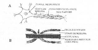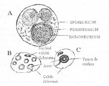 Anatomia nervului periferic. A. Sectiune transversala printr-un nerv periferic; B. Sectiune transversala printr-o fibra nervoasa nemielinizata;