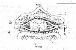 Continutul canalului rahidian. Sectiunea transversala. 1. Spatiul peridural; 2. Spatiul subarahnoidian; 3. Radacini rahidiene; 4. Nervul spinal