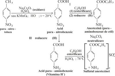Anestezina se poate prepara pornind de la p-nitrotoluen, conform ecuatiilor reactiilor: