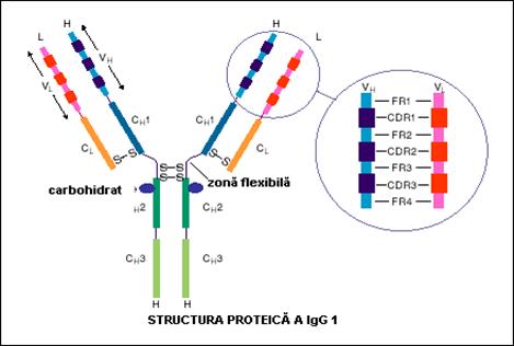 Imunoglobulinele sau anticorpii sunt glicoproteine ce sunt sintetizate de catre plasmocite, acestea provenind din limfocitele B transformate blastic. Imunoglobulinele nou sintetizate au aceeasi specificitate antigenica ca cea a Ig exprimate la suprafata limfocitelor B (lgM sau mai rar IgD). Molecula de baza a Ig este constituita din patru lanturi - doua lanturi grele (H - heavy) cu o greutate moleculara cuprinsa īntre 50 si 70 kDa si doua lanturi usoare (L - light) de 22 kDa, ele fiind solidarizate prin punti disulfurice. Studiile de clivare proteolitica cu papaina au aratat ca imunoglobulinele sunt constituite din trei fragmente diferite structural, ele avānd particularitatile functionale distincte:
