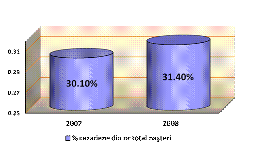 Grafic 2. Evolutia procentului de cezariene din totalul nasterilor, in perioada 2007 – 2008,