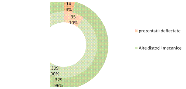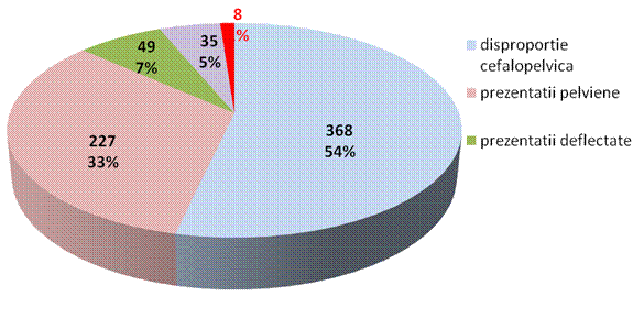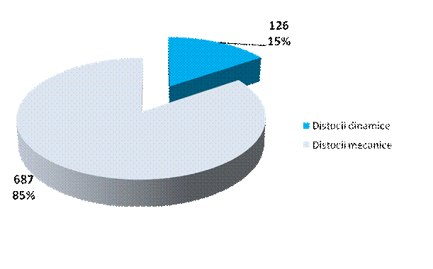 Grafic 9. Ponderea diferitelor tipuri de distocii mecanice, din totalul distociilor mecanice ce au constituit indicatie pentru cezariana, in perioada 2007 – 2008, in cadrul Spitalului de Obstetrica-Ginecologie „Prof. Dr. Panait Sirbu” din Bucuresti