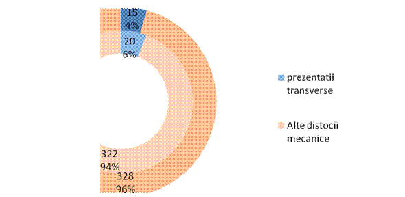 Distocia de prezentatie reprezinta situarea fatului, in momentul travaliului, intr-o pozitie care face incerta (prezentatii pseudo-distocice) sau imposibila (prezentatii distocice) nasterea pe cale vaginala. Daca in cazul prezentatiilor distocice nu se discuta indicatia de cezariana, aceasta prezentatie reprezentand o indicatie absoluta, in cazul celor pseudo-distocice, intrunirea anumitor conditii sau modificarea acestor date de ultim moment pot permite o nastere pe cale vaginala. Nasterea la termen a unui fat viu de volum normal este imposibila. În travaliu, sub influenta contractiilor uterine, partea de prezentatie – umarul – coboara si patrunde in bazin, trunchiul si craniul ramanand deasupra stramtorii superioare. Ca urmare a acestor modificari segmentul inferior este foarte destins si se poate produce ruptura uterina. Nasterea se poate termina spontan la fetii foarte mici (avortoni) sau la fetii morti si macerati prin urmatoarele mecanisme: in mod exceptional, sub influenta contractiilor violente, fatul se poate redresa, prezentatia transformandu-se in una longitudinala (craniana sau pelviana). Acest mecanism este versiunea spontana. expulzia spontana printr-o turtire exagerata a toracelui si abdomenului, care traverseaza simultan filiera pelvi-genitala – fatul este complet indoit – conduplicatio corpore. Grafic 7. Proportia anuala a numarului de prezentatii transverse, din totalul distociilor mecanice ca indicatii pentru cezariana, din totalul operatiilor cezariene efectuate in perioada 2007 – 2008, in cadrul Spitalului de Obstetrica-Ginecologie „Prof. Dr. Panait Sirbu” din Bucuresti