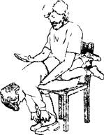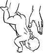 Capul copilului trebuie sa fie mai jos decit corpul lui. Degetele de la cealalta mina se plaseaza pe ceafa si cu baza palmei facem 4-5 lovituri usoare intre omoplati. Respectarea acestei pozitii este obligatorie pentru a evita traumatizmul gatului. Daca corpul strain nu a iesit, faceti compresii abdominale, cu 2 degete. Fiti precauti la extragerea corpului strain din gurita copilului.