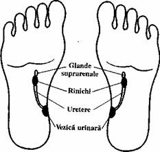 Zonele reflexe ale rinichilor sunt amplasate în mijlocul talpilor (în dreptul degetului 2), cele ale suprarenalelor imediat deasupra zonelor renale, iar zonel 353o1416d e reflexe ale ureterelor se întind pâna la marginea laterointerna a piciorului, unde se termina cu zona vezicii urinare.