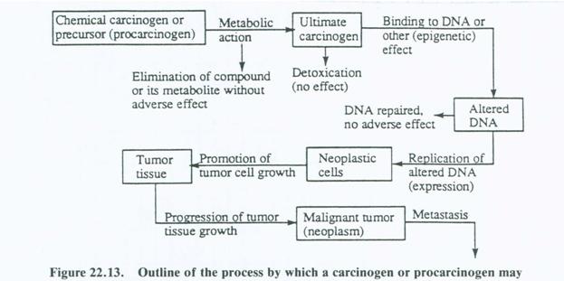 Marea cheltuiala de timp si de bani asupra subiectului in ultimii ani, au condus la o mai buna intelegere a bazelor biochimice si chimice ce determina carcinogeneza. Procesul global pentru producerea (inducerea) cancerului poate fi relativ complex, implicand numeroase etape. Totusi, inb general, se recunoaste ca exista doua etape principale in carcinogeneza, un stadiu initial urmat de un stadiu de promovare (de avansare). Aceste etape sunt in plus subdivizate asa cum se prezinta in fig. 22.13.