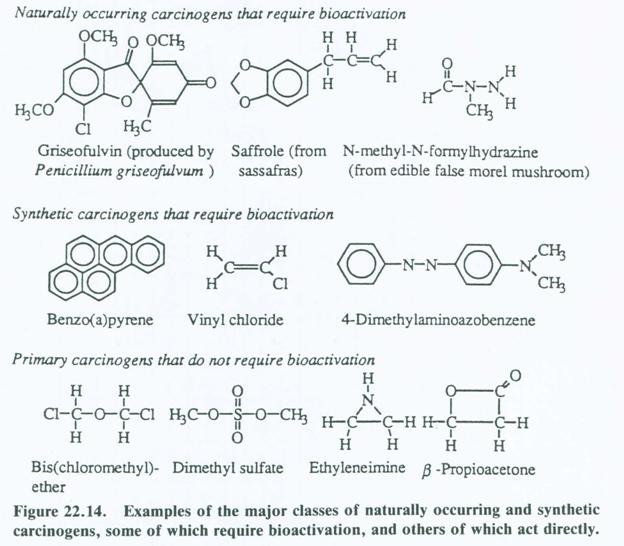 Initierea carcinogenezei se poate produce prin reactia speciilor ADN reactive cu ADN sau prin actiunea unui carcinogen epigenetic care nu reactioneaza cu ADN si este carcinogenic printr-un alt mecanism. Multe specii reactive ale ADN sunt carcinogenic genotoxice din cauza ca ele sunt factori mutageni. Aceste substante reactioneaza ireversibil cu ADN. Ele sunt fie electrofile sau, mai obisnuit, specii in forma electrofila activate metabolic, precum este cazul cu grupa electrofila +CH3 generata din dimetilnitrozamina; este discutata in conditiile mutagenezei de mai sus. Substantele determinate ca fiind necesare metabolic pentru activare sunt denumite procarcinogenice. Substantele - speciile metabolice - responsabile actualmente pentru carcinogeneza sunt numite carcinogeni finali. Unele specii care sunt metaboliti intermediari intre procarcinogeni si carcinogeni finali se numesc carcinogeni primari. Carcinogenii care nu necesita activare biochimica sunt clasificati ca primari sau carcinogenici cu actiune directa. Unele exemple de procarcinogeneza si carcinogeni primari sunt prezente in fig. 22.14.