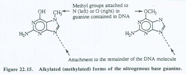 Substantele chimice carcinogene au, de obicei, capacitatea de a forma legaturi covalente cu macromoleculele vietii. Asemenea legaturi covalente se pot forma cu proteine, peptide, ARN, si ADN. Desi in majoritatea cazurilor legarea este cu alte tipuri de molecule, aductii cu ADN sunt semnificativi in initierea cancerului. Printre speciile care se leaga la ADN in carcinogeneza sunt in principal sunt agenti de alchilare care ataseaza o grupare alchil - precum metil (CH3) sau etil (C2H5) - la ADN. Un tip similar de compus se formeaza cu agentii de arilare care actioneaza prin atasarea unei grupe aril, de exemplu, gruparea fenil (C6H5) la ADN. Asa cum se constata din exemplele prezentate in fig. 22.15, grupele alchil sau aril se ataseaza de atonii de N si O din bazele azotate din ADN. Aceasta alterare in ADN poate initia secventa de evenimente care rezulta in cresterea si replicarea unor celule neoplazice (canceroase). Speciile respective care furnizeaza grupe alchil in alchilare sunt de obicei formate prin activitate metabolica asa cum rezulta din discutarea mutagenezei pentru dimetilnitrozamina.