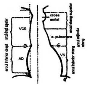 - arcul inferior drept format de atriul drept, este convex si situat la o distanta dubla de linia mediana fata de cel superior