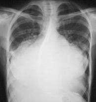 De la 300-500 ml se evidentiaza radiologic. Umbra cardiaca este marita bilateral, mai ales spre stânga, având un aspect triunghiular. Cele doua margini ale opacitatii cardiace se indeparteaza, descriind arcuri mari convexe spre diafragm. Raportul cardio-toracic e inversat. Uneori, în interiorul acestei mase opace se distinge o opacitate mai intensa, care reprezinta opacitatea cordului, realizându-se în felul acesta un contur dublu.