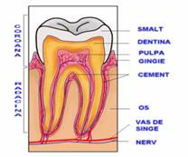 Fiecare dinte are doua parti principale :una este coroana,aflata la suprafata gingiei cealalta este radacina,in functie de tipul dintelui si pozitia acestuia in cavitatea bucala,un singur dinte poate avea de la una la trei radacini,acestea sunt infite in osul maxilarului.
