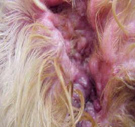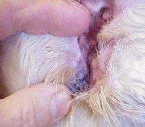 Examinarea urechilor este dureroasa. Se observa secretii abundente, iar dupa curatire aspectul este redat în imaginile urmatoare. Acelasi aspect se observa si la examinarea otoscopica a conductului auditiv extern.