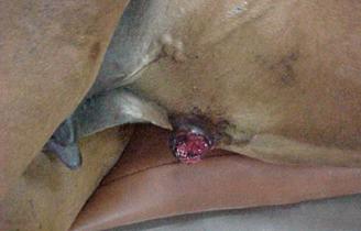Urineaza cu sânge, uneori se observa picurari de sânge între mictiuni. De cca. 10 zile a aparut o umflatura rosietica exteriorizata din vulva