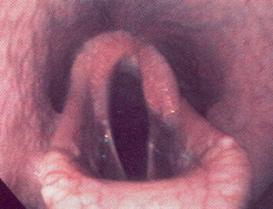 Examinarea endoscopica releva în majoritatea cazurilor un asincronism al miscarii proceselor corniculate în timpul respiratiei – vezi foto