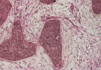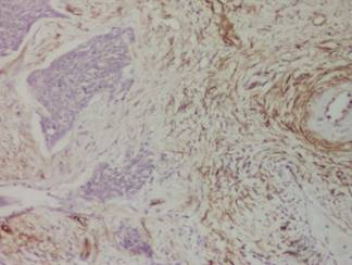 Figura 5: Carcinom microinvaziv. Placardele tumorale sunt inconjurate