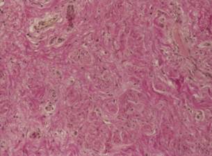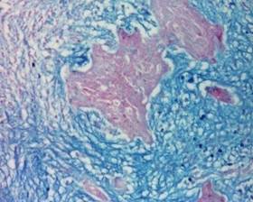 Placarde de celule tumorale înconjurate de fibre colagene tinere fuxin-negative.