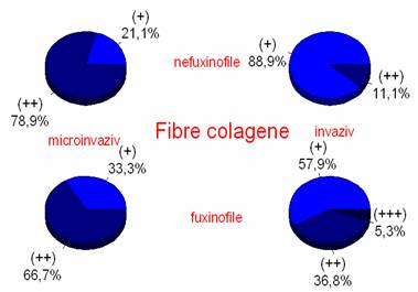 Evaluarea semicantitativa pe care am efectuat-o lotului intrat în studiu demonstreaza intensificarea maturarii fibrelor colagene ce devin fuxinofile, în special în cazul formelor invazive de carcinom scuamos al colului uterin.