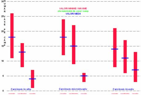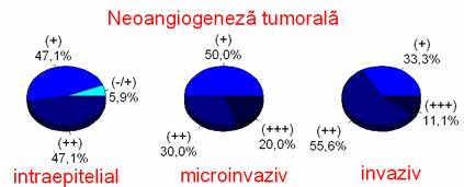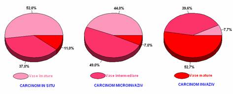 Ulterior, pentru ca tumora constituita sa dezvolte potential metastatic si letal, este necesar ca aceasta sa-si organizeze si sa-si întretina propria retea vasculara - proces denumit angiogeneza tumorala. Apreciind semicantitati la cele 60 de paciente modul de formare al neovascularizatiei putem observa cu usurinta ca proportional cu progresia bolii se intensifica si retelele vaselor de neoformatie asa cum este ilustrat si în graficul urmator