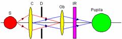 Elemente componente: S - sursa; C - condensor; D - diafragma; Ob - obiectiv; IR - filtru pentru infrarosu. Functionare: Imaginea sursei in infrarosu este proiectata pe pupila ochiului. Fluxul incident pe retina este independent de marimea pupilei. Fiecare canal este afectat de patru filtre de densitate neutrala cu atenuarile de 0,5; 1,0; 2,0; 4,0. |